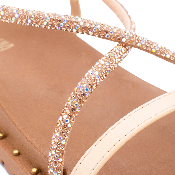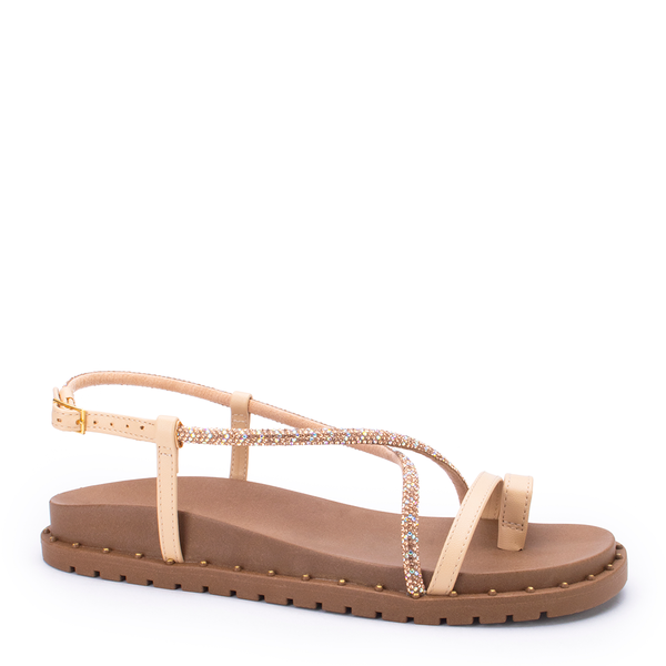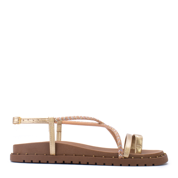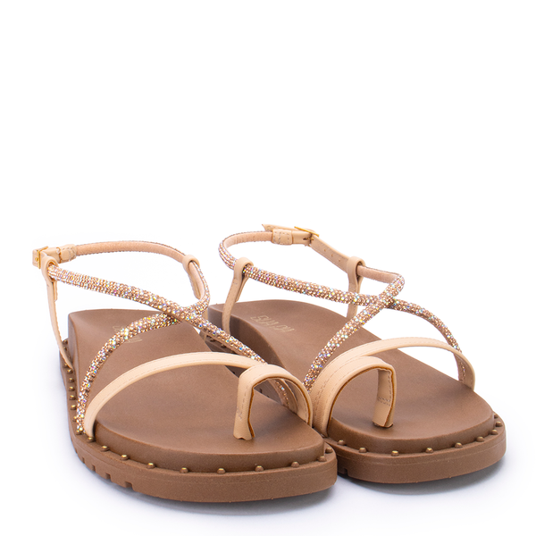 A Sandália Rasteira Sua Cia é a escolha ideal para quem busca estilo e praticidade no dia a dia. Com tiras finas douradas e aplicação de strass que garantem brilho e sofisticação, ela combina conforto e modernidade. O solado leve com detalhe em tachas traz segurança e charme extra, perfeito para compor looks casuais ou mais arrumados.